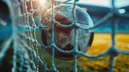 A soccer ball nestled in the net after scoring a goal, with a blurred background conveying the excitement of the game.