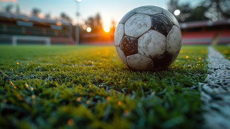 A lone soccer ball rests on lush green grass, illuminated by warm sunlight during sunset. The blurred background enhances the serene atmosphere ideal for sports.