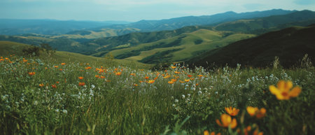 Cinematic view of vibrant wildflowers on rolling hills under a clear sky