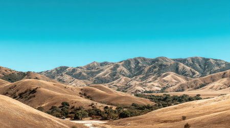 This stunning landscape showcases rolling hills and majestic mountains under a clear blue sky, capturing the essence of nature's beauty in a dry season.