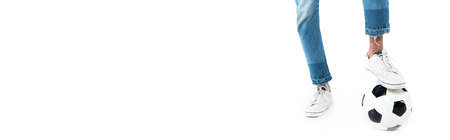 cropped view of african american man in jeans and sneakers playing football on white, banner