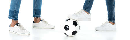 cropped view of interracial men in jeans and sneakers near soccer ball on white, banner