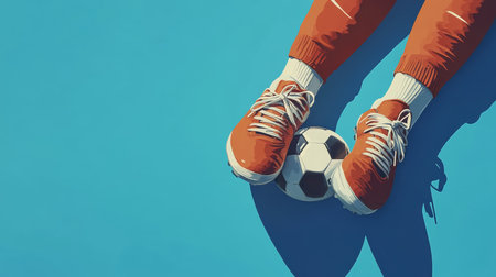 Soccer ball placed under players feet, highlighted against a bright blue background in action