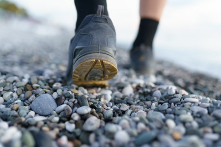 Close up a person's feet walking on rocks , Walking on a trail in the woods , Travel Concept , Generative Ai Technology