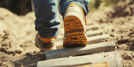 A person is walking on a path with a pair of yellow shoes. The shoes are worn and have a worn out appearance. The person is walking on a path with a wooden ladder. AI generated.