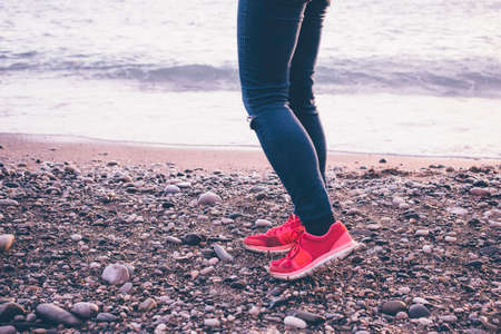 Legs and sneakers on the sea beach. Travel Lifestyle Summer vacations. Trendy concept.