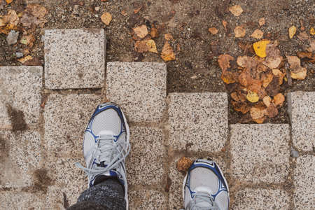 Unfinished pavement with fallen leaves and man's feet. Depressed emotions or crisis concept
