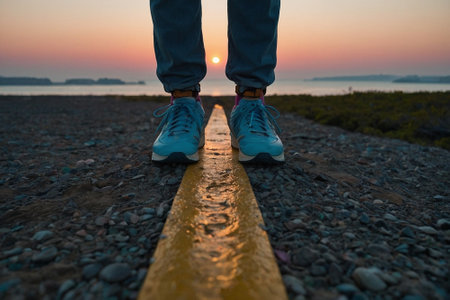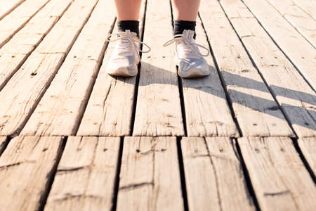 sneakers on ground, woman taking a walk on the summer road in sunny evening. top view at legs and shoes on ground asphalt. travel and vacation. exercise outdoors
