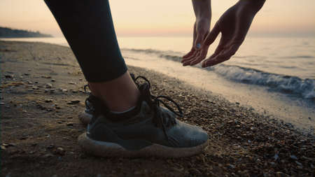 Unknown sportswoman reaching hands to ground standing on wet sand outdoors close up. Sporty woman bending body forward stretching at sunset. Unrecognizable slim girl training near ocean waves.