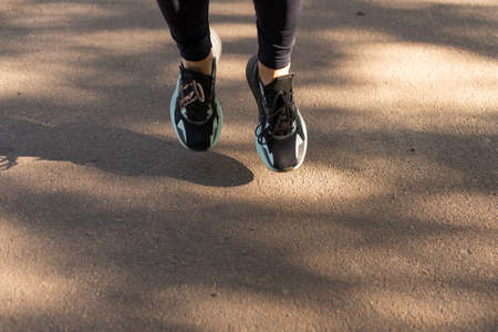 Feet of a runner. Young girl runs in the forest. Close-up of sneakers.