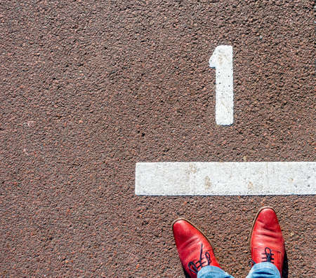 An overhead shot of a man in red shoes standing in front of a number 1 line