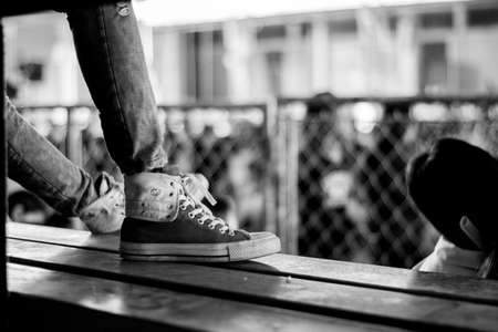 Legs of people sitting and waiting concept. Legs of sitting man in sneakers indoor