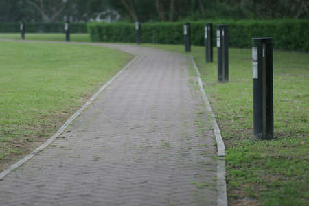 A serene walkway paved with tiles stretches through a lush green park. Ideal for nature lovers, this image captures a tranquil path, inviting exploration and relaxation.