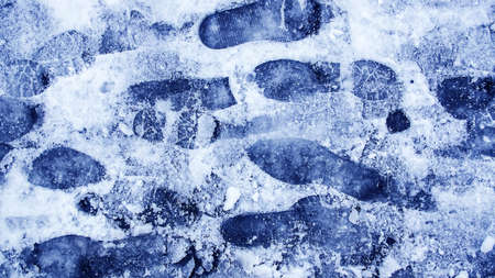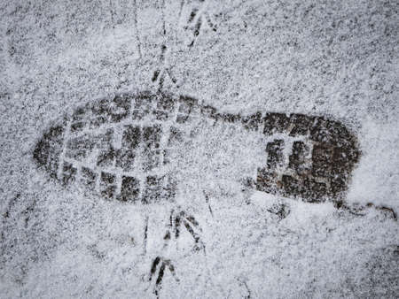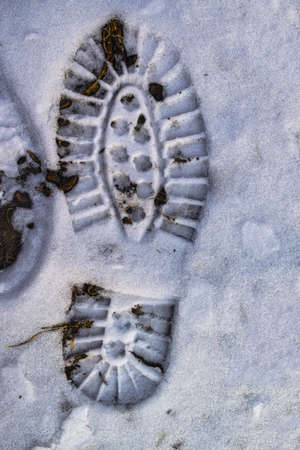 Footprint or bootprint in fresh snow cold track walking in winter icy adventure