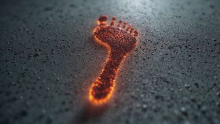 Digital Footprint: A faint, glowing human footprint made of binary code on a clean white floor, symbolizing the traces we leave in the digital world. Minimal abstract
