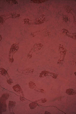 The black footprints on the wall are mystical. Footprints in a gloomy Halloween style. Photos with noises, grain - Halloween, paper decorations.
