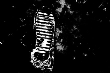 A single boot print in wet mud on a stone floor, showing texture and depth in every ridge