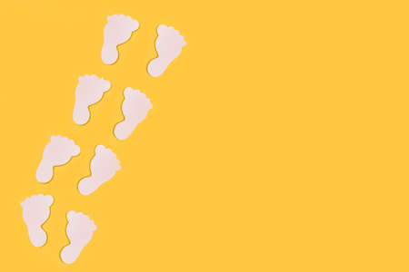 A path of wooden white footprint on a yellow background with copy space