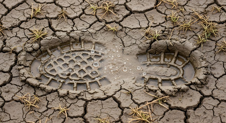 A single, detailed boot print is impressed into dry, cracked mud. The footprint is filled with a small puddle of water, contrasting with the arid, parched earth surrounding it, symbolizing drought, human impact, or a recent rain.