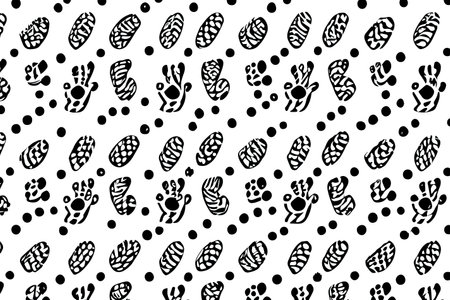 Irregular repeating pattern of human footprints on black isolated