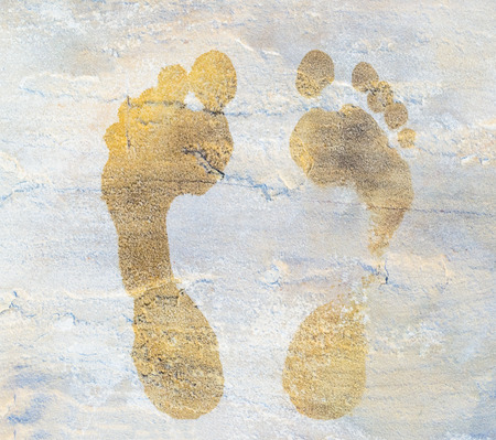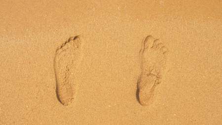 Human footprint with barefoot feet in brown yellow sand beach background, active healthy living and personal growth concept, copy space