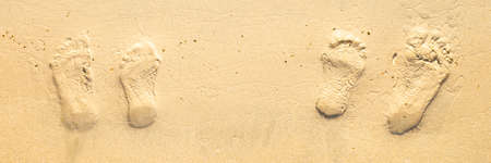 Footprints in sand. Feet of mother and child walk along shore. Summer memories.