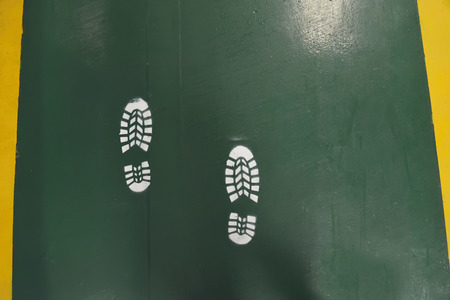 Social Distancing for footprint on the floor to sign for standing 2metres for each person. Keep distance in public society people to protect from COVID-19 coronavirus outbreak spreading concept