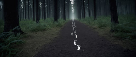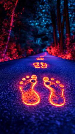 Shows glowing footprints illuminated on asphalt pathway extending through a forest landscape with a vibrant and colorful atmosphere. The setting is a forest with red and blue lighting.