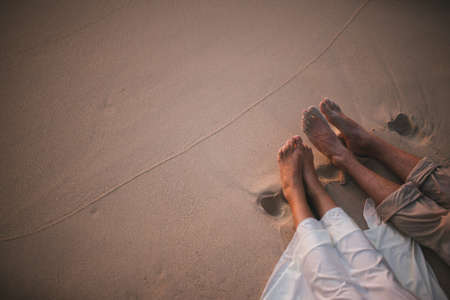Legs of couple resting on the sand. Honeymoon of the newlyweds concept