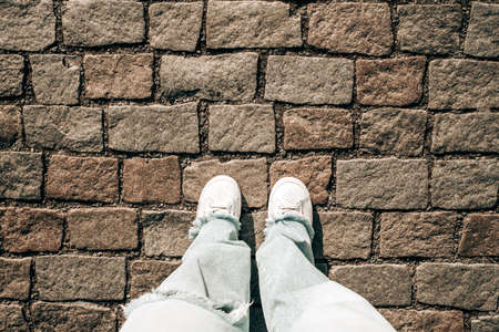 Female legs in jeans and white sneakers on paving stones. Teenage feet top view. Prague street, old city