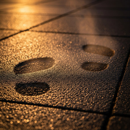 Reflective puddles show boots and footprints in a quiet, damp alley during early evening. The scene evokes solitude.