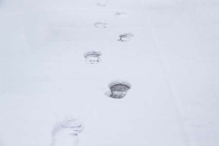 A steps against snow background. footprints on white snow background of boots. Human traces on snow.