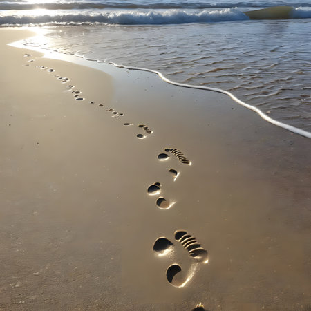 Footprints in the textured brown sand leading towards the sea, creating a sense of journey and exploration on the beach