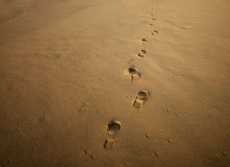 Human footprints on the sand of a beach during a peaceful late summer sunrise.