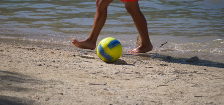 Child playing soccer on the beach. Selective focus on the ball
