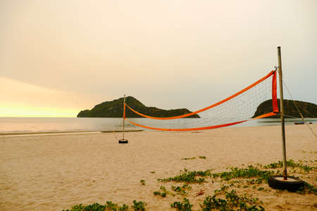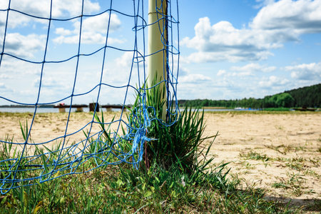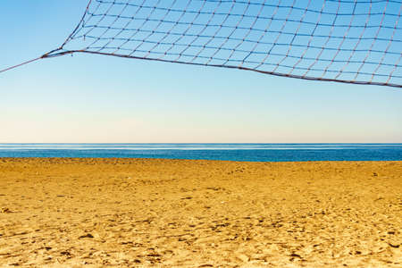 Volleyball summer sport equipment. Net netting wire on sandy beach outdoor. Active lifestyle.