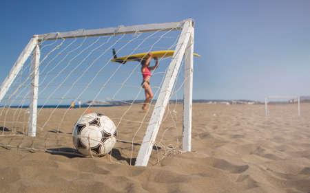 Summer vacation, active lifestyle concept. Football gate on sandy beach soccer goal