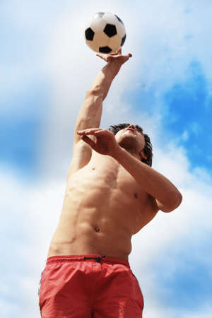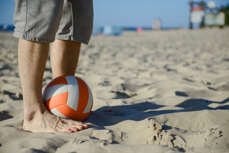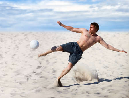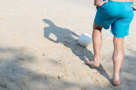 Low section portrait of handsome man playing soccer on the sand beach