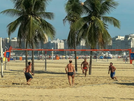 RIO DE JANEIRO, BRAZIL- 27, MAY, 2016: wide shot of a footvolley game on copacabana beach in rio
