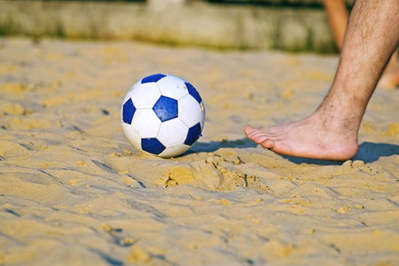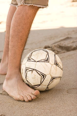Close-up of male foot playing football on sand. Young man on beach playing soccer