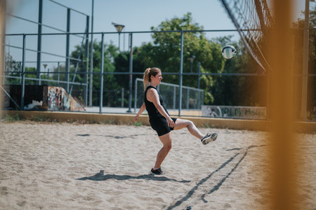 Athlete woman playing volleyball on a sandy court near a fence in the park