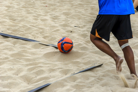 Feet playing ball on a sandy beach. Sport concept.