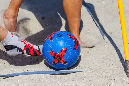 Odessa, Ukraine-July 25, 2020: Beach Soccer Championship among amateur women on beach. Soccer in sand. Young beautiful girls playing beach football on sand of city beach. Football on sand