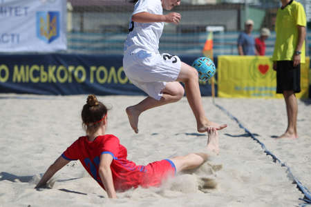 ODESSA, UKRAINE July 8, 2021: Ukrainian Beach Soccer Women's Cup. The girl's footballers are desperately playing beach soccer on sand of sea city beach on a hot sunny day. Women's soccer on sand