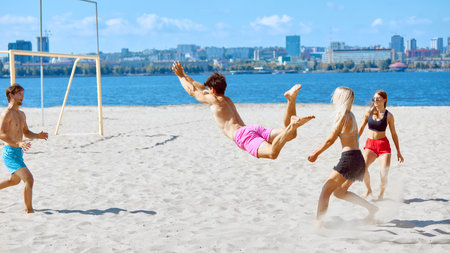 Dynamic game. Young people, friends spending sunny day by the river, playing beach volleyball with fun and enthusiasm