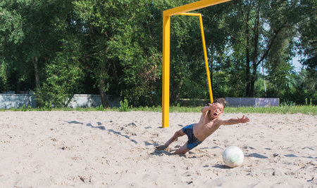 A little boy plays football on the sand, catches the ball while standing on the gate