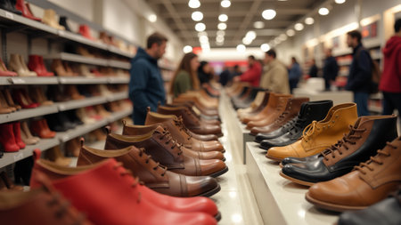 Customers browse thoughtfully among countless pairs of shoes, highlighting diverse styles and colors that fill the shelves, creating a lively shopping atmosphere in the early afternoon.