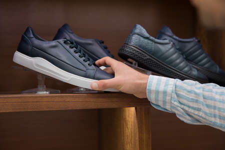 Fashion Casual Male Sneakers On Shelves In Store Of Shopping Cen