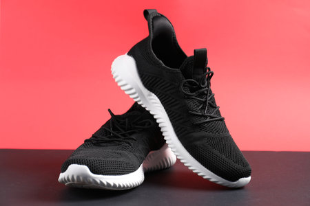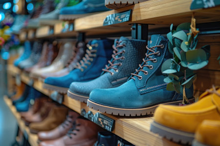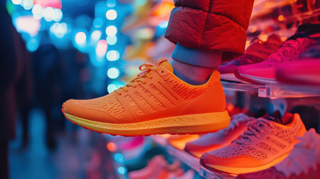Stock photo of trendy athletic shoes in a modern boutique display. Concept Athletic shoes, Boutique display, Trendy fashion, Footwear, Lifestyle trends