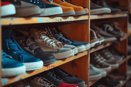 An inviting display of assorted shoes on a wooden shelf highlights the charm of personal style and footwear fashion, featuring various designs that blend elegance and comfort seamlessly.